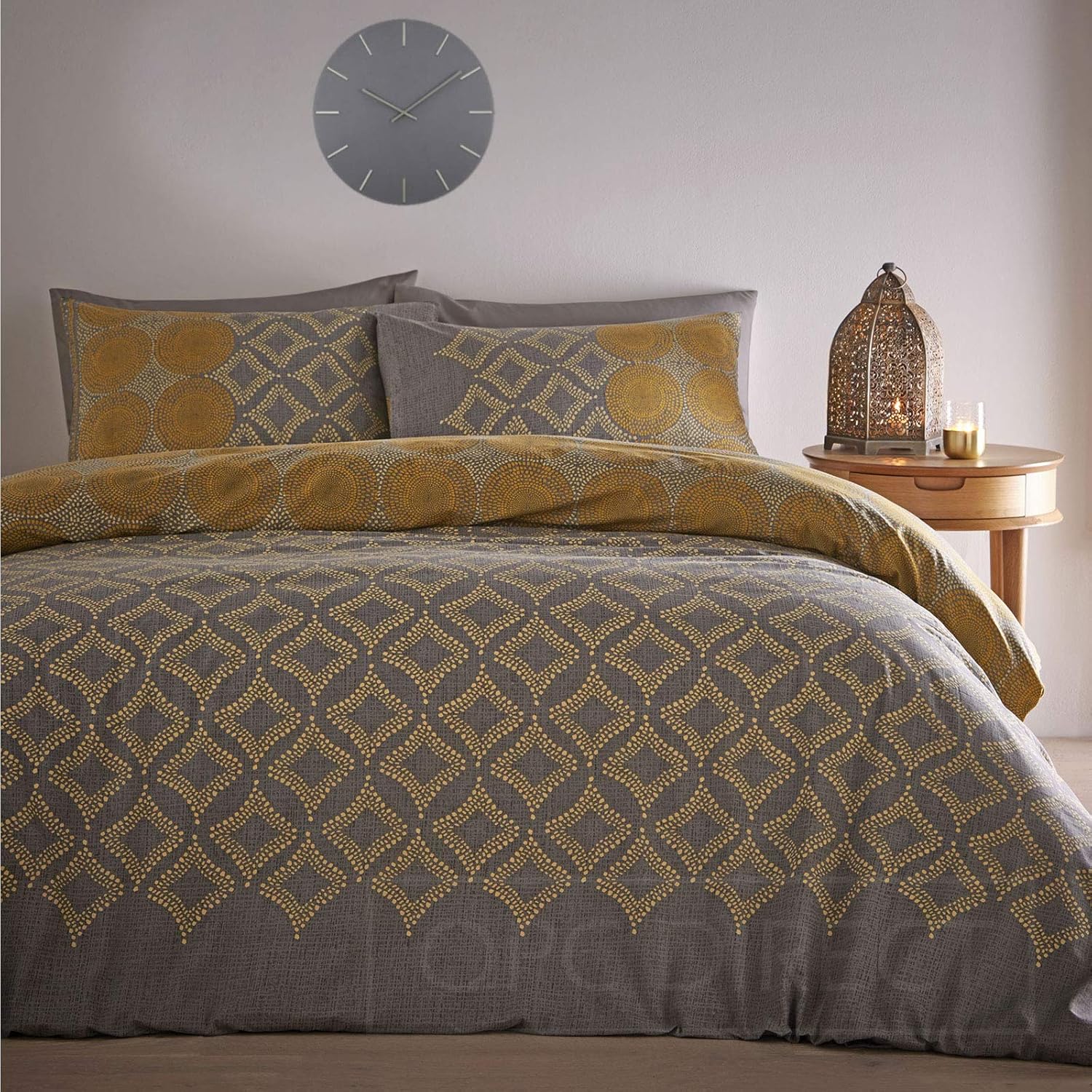 Prism 100 Cotton Printed Double Bed Set Mustard Grey From Made Com Grey Teal Express Delivery Geometric Chic Bedroom Design Bedroom Design Scandi Bedroom